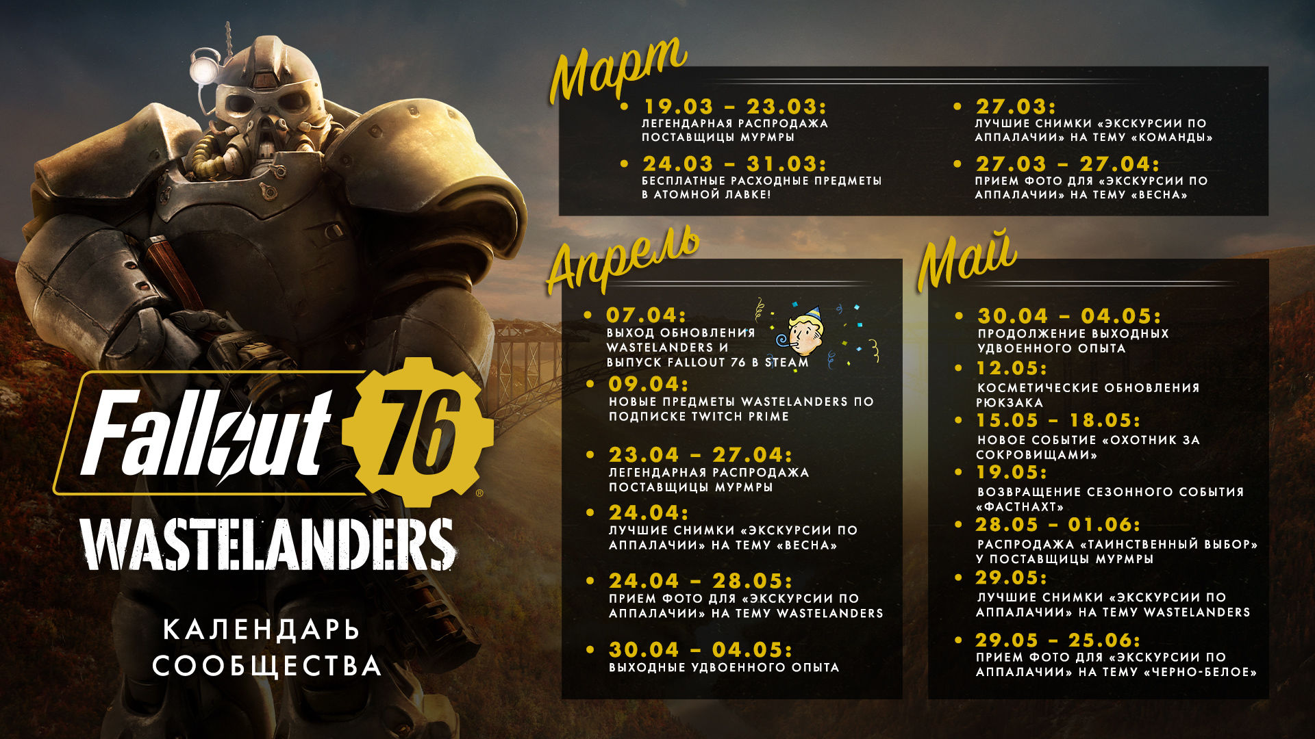 Спустя год после событий основной игры в Аппалачию начинают возвращаться люди. Они услышали по радио слухи о сокровищах, которые спрятаны в глубине региона. Среди людей оказались две организации, которые захотели обосноваться в этом регионе: поселенцы, которые хотят восстановить Аппалачию, и рейдеры, которые хотят обогатиться за счёт поселенцев.