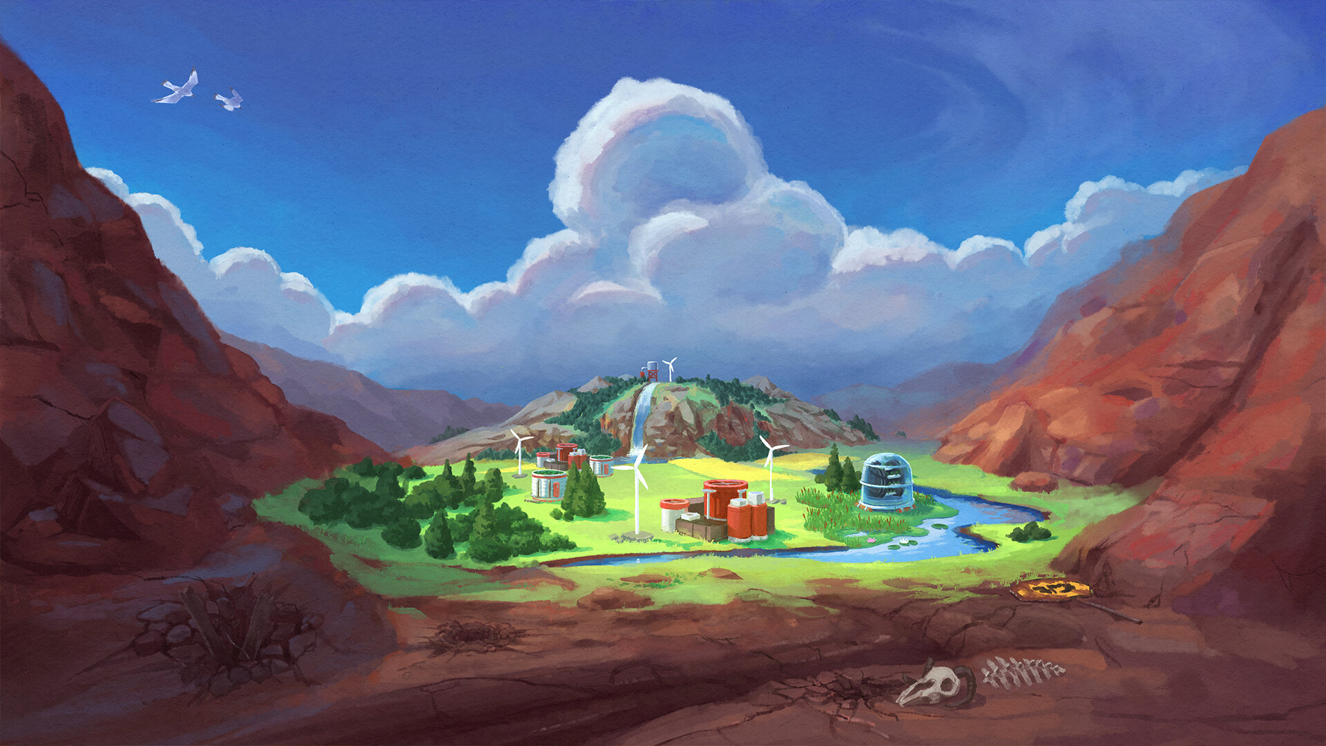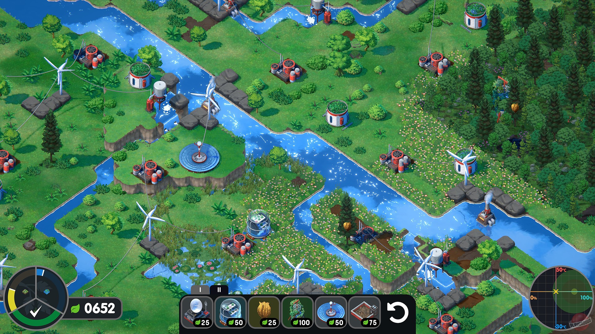 Terra Nil – необычный обратный градостроительный симулятор с изометрическим видом камеры, который посвящен восстановлению дикой природы в безводной пустоши. Геймплей состоит из двух этапов. Сначала нужно создать устойчивую экосистему – посадить леса, обеспечить водоснабжение и так далее. На этой стадии допускаются методы строительства с низким уровнем воздействия на природу. Позже игра меняется. Как только экосистема снова заработает, нужно убрать следы присутствия, разобрать сооружения и, фактически, вернуть местность к первозданному виду.